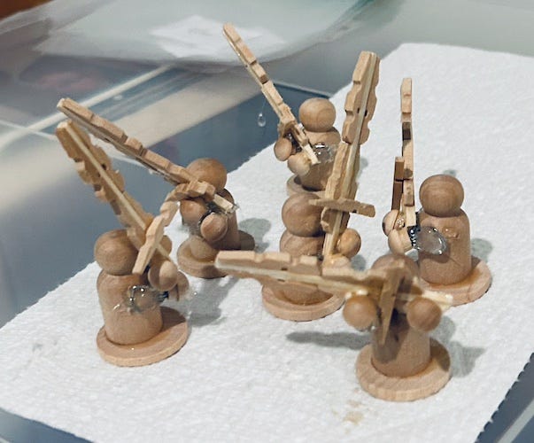 Another thing that has to wait is finishing my crafted Vaporous Realms at War character miniatures. They’re almost built, but I’ve put way, way, way too much planning and labor into these little suckers to rush the painting and finishing touches. Let’s just say there are a lot of naked ridge-cats, dread-beaks, and peg people staring at me when I walk into my office. On the upside, I’m closer than ever to a decades-long dream of making non-boring peg people versions of my story characters! Future M. B. Heywood will have a lot of fun completing that project in 2024.
