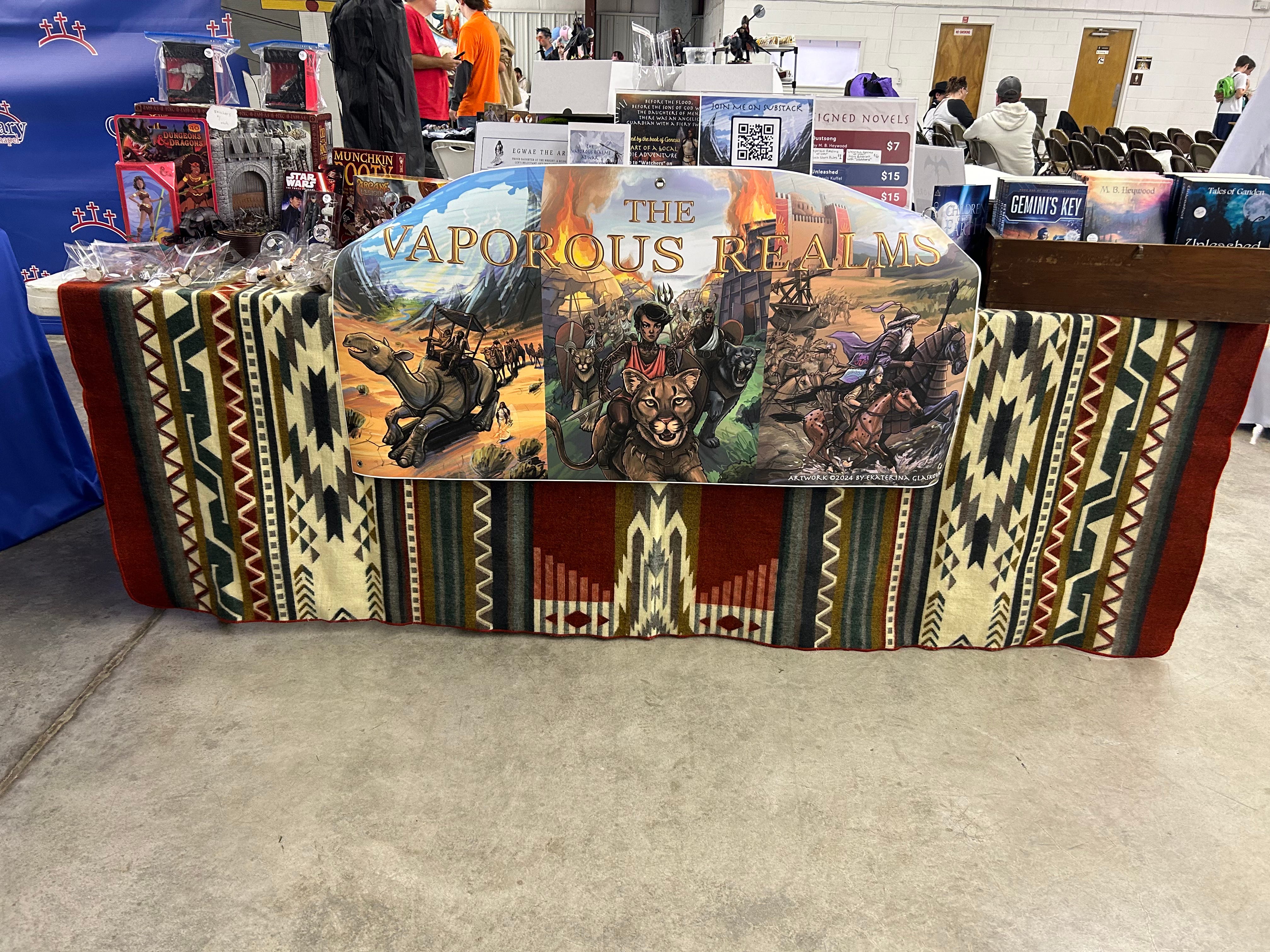 That’s the one halfway decent pic I got of my comic con setup last weekend. What friendly folks and what a lively event. The predawn drive into the Appalachian hinterlands was an adventure, but when the sunlight catches those hulking green mountains just right, it’s something else. Writerly inspiration for one of the Westsong kingdoms I’ll write about sooner or later.
