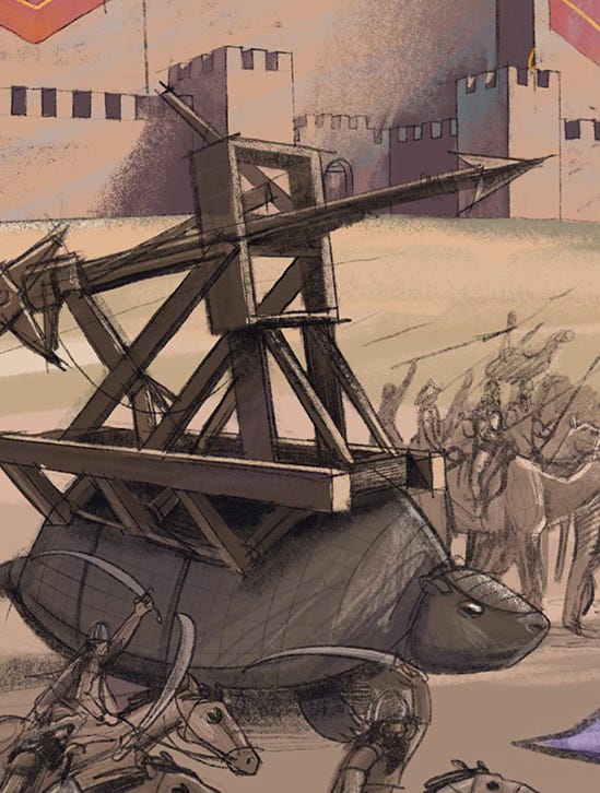 Human-folk of the Lost Kingdom—and, later, the westernmost settlements of the Southern Redeemed kingdoms—captured and trained shell-backs for such purposes as plowing, heavy transport, and constructing or battering fortifications. In the fourth epoch, the armies of the Prophet-King mounted lesser war-machines, chiefly stingers, upon the creatures’ shelled backs to serve as roving artillery emplacements. Lore had it that shell-backs also inspired the leather-scale armor popular among lost-folk houses of greater means.